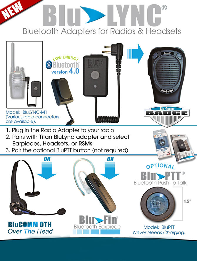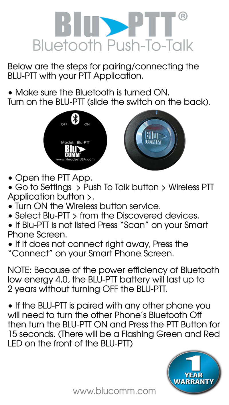 Product Description Documents Total Price: Add to Cart Please choose options for all selected products This Item: Blucomm Bluetooth PTT (You save ) Product Description Blucomm Blu-PTT Bluetooth Push to Talk Button Discontinued - Replaced by Blu-PTT+ Push to Talk Button Bluetooth push to talk button that can be used with BluLync adapters Blu-PTT is easy to pair, and remotely controls the PTT application running on your smart device. Simply pair, press, and talk Features : Turns your phone into a 2 way radio or pair to BluLync adapters and bring bluetooth functionality to your radio. 2 Year Battery Life, the Blu-PTT does not require charging Low Energy 4.0 bluetooth Android and iOS compatible - AT&T EPTT, Zello, ESchat, and GroupTalk, Kodiak,Verizon Wireless, compatible Push to Talk applications Documents Blucomm PTT Blucomm PTT Flyer Blucomm PTT User Guide