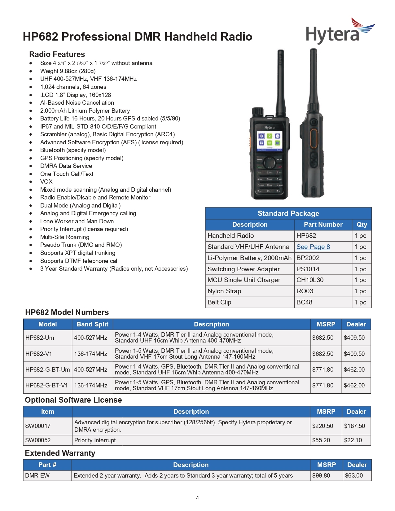 Product Description Documents Related Products Request a Quote Rebates Product Description HP682 Professional DMR Handheld Radio Radio Features: Size 4 3/4” x 2 5/32” x 1 7/32” (without antenna) Weight 9.88oz (280g) UHF 400-527MHz, VHF 136-174MHz 1,024 channels, 64 zones LCD 1.8” Display, 160x128 AI-Based Noise Cancellation 2,000mAh Lithium Polymer Battery Battery Life: 16 hours (20 hours with GPS disabled) (5/5/90) IP67 and MIL-STD-810 C/D/E/F/G compliant Scrambler (analog), Basic Digital Encryption (ARC4) Advanced Software Encryption (AES) (license required) Bluetooth (specify model) GPS Positioning (specify model) DMRA Data Service One Touch Call/Text VOX Mixed mode scanning (Analog and Digital channels) Radio Enable/Disable and Remote Monitor Dual Mode (Analog and Digital) Analog and Digital Emergency calling Lone Worker and Man Down Priority Interrupt (license required) Multi-Site Roaming Pseudo Trunk (DMO and RMO) Supports XPT digital trunking Supports DTMF telephone call 3 Year Standard Warranty (radios only, not accessories) Standard Package: ItemPart #Qty Handheld Radio HP682 1 pc Standard VHF/UHF Antenna See Page 8 1 pc Li-Polymer Battery, 2000mAh BP2002 1 pc Switching Power Adapter PS1014 1 pc MCU Single Unit Charger CH10L30 1 pc Nylon Strap RO03 1 pc Belt Clip BC48 1 pc HP682 Model Numbers: ModelBand SplitDescriptionMSRP HP682-Um 400-527MHz Power 1-4 Watts, DMR Tier II and Analog conventional mode, Standard UHF 16cm Whip Antenna 400-470MHz $682.50 HP682-V1 136-174MHz Power 1-5 Watts, DMR Tier II and Analog conventional mode, Standard VHF 17cm Stout Long Antenna 147-160MHz $682.50 HP682-G-BT-Um 400-527MHz Power 1-4 Watts, GPS, Bluetooth, DMR Tier II and Analog conventional mode, Standard UHF 16cm Whip Antenna 400-470MHz $771.80 HP682-G-BT-V1 136-174MHz Power 1-5 Watts, GPS, Bluetooth, DMR Tier II and Analog conventional mode, Standard VHF 17cm Stout Long Antenna 147-160MHz $771.80 Optional Software License: ItemDescriptionMSRP SW00017 Advanced digital encryption for subscriber (128/256bit). Specify Hytera proprietary or DMRA encryption. $220.50 SW00052 Priority Interrupt $55.20 Extended Warranty: Part #DescriptionMSRP DMR-EW Extended 2 year warranty. Adds 2 years to Standard 3 year warranty; total of 5 years $99.80 Please refer to the HP682 Professional DMR Handheld Radio Data Sheet for specifications. Request a Quote Request a Quote Rebates Check for Rebates Documents HP682 Professional DMR Handheld Radio Data Sheet
